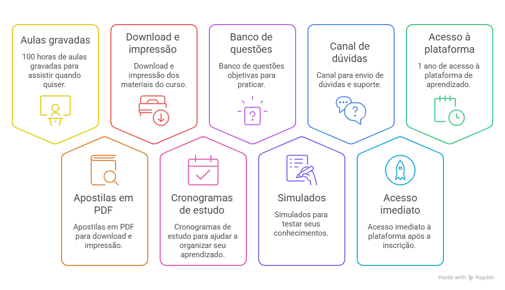 ✔️ O curso é composto por 100 horas de aulas gravadas, permitindo que você estude no seu próprio ritmo e conforme sua disponibilidade. Além disso são disponibilizadas apostilas em PDF (que permitem download e impressão) e cronogramas de estudos com prazos variados.